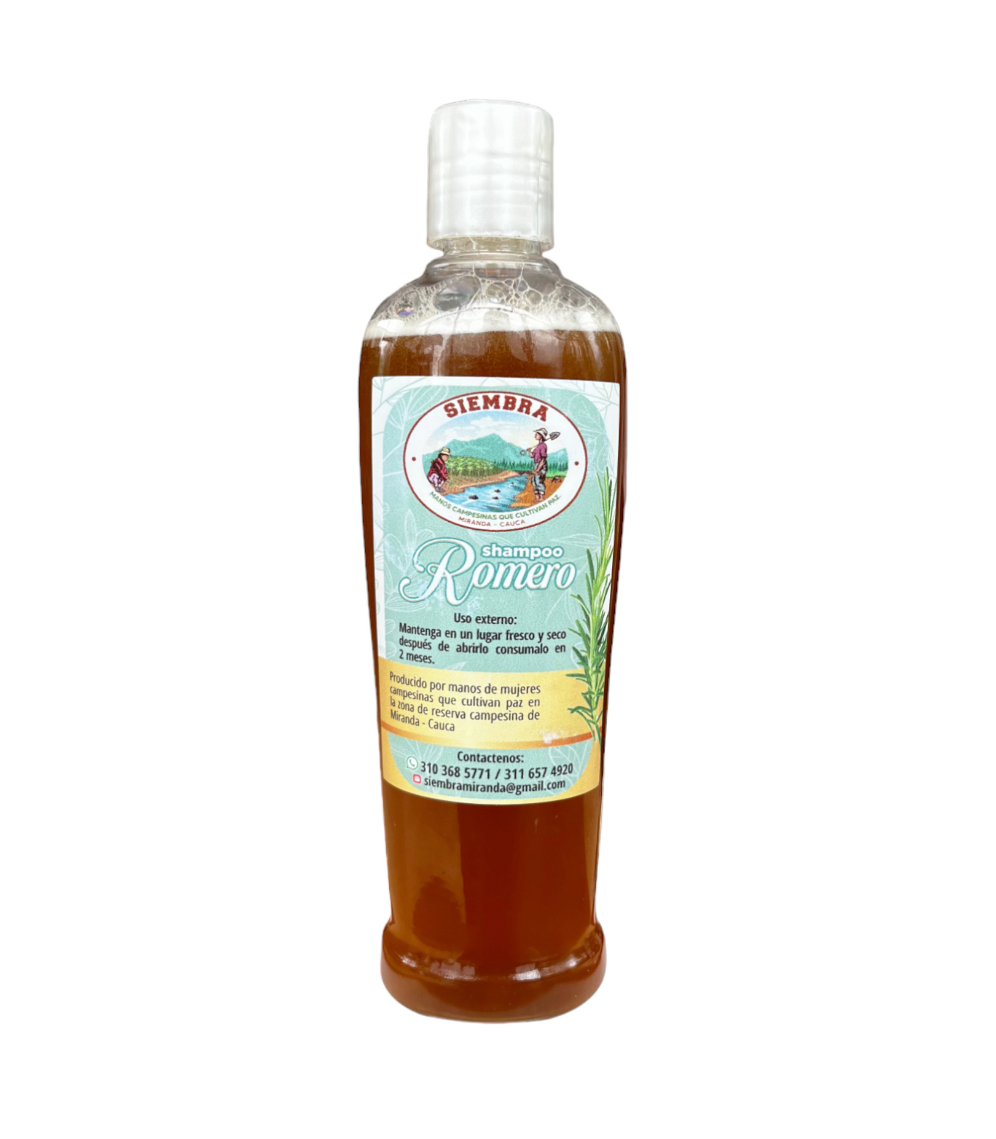 Este shampoo a base de Romero es producido de manera 100% orgánica en el municipio de Miranda, Cauca. Es hecho por 30 mujeres campesinas de la Asociación ASPROZONAC, quienes se organizaron en el Comité Mujer y Familia. Ellas son las que cultivan las plantas medicinales, las cosechan, transforman y comercializan.