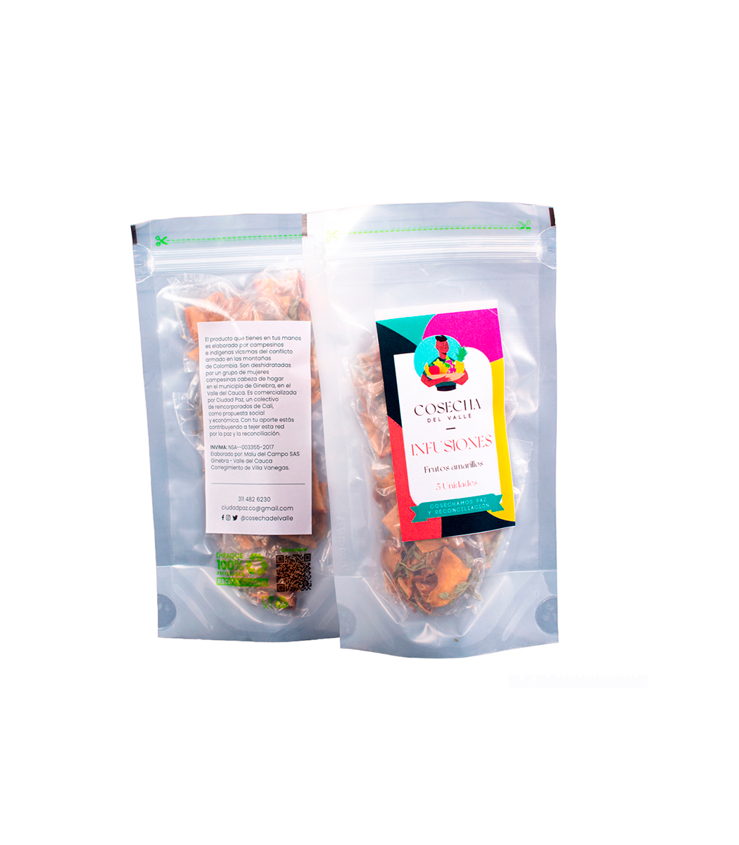El producto que tienes en tus manos es elaborado por campesinos e indígenas víctimas del conflicto armado en las montañas de Colombia. Son deshidratadas por un grupo de mujeres campesinas cabeza de hogar en el municipio de Ginebra, en el Valle del Cauca. Es comercializada por Ciudad Paz, un colectivo de reincorporados de Cali, como propuesta social y económica. Con tu aporte estás contribuyendo a tejer esta red por la paz y la reconciliación.